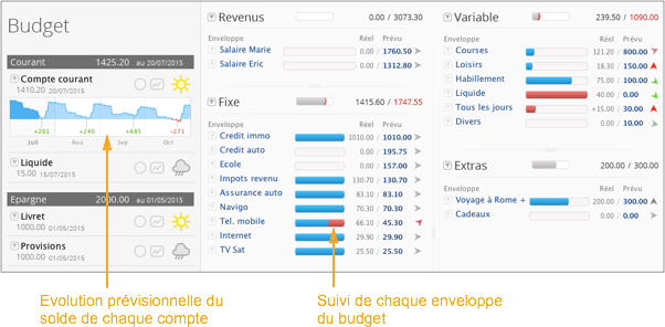 Les suivi des enveloppes vous permet d'avoir une vision d'ensemble de votre budget bien plus claire qu'une longue liste d'opérations. Pour chaque enveloppe, un montant est prévu pour chaque mois. C'est en réglant ce montant prévu que vous pouvez régler votre budget pour avoir un prévisionnel fiable.
